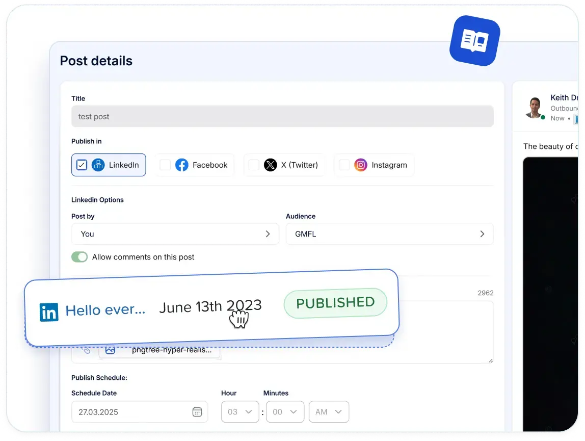 Plan and schedule content with our AI-powered social media post automation tool for LinkedIn, Instagram, Facebook, and X (Twitter)